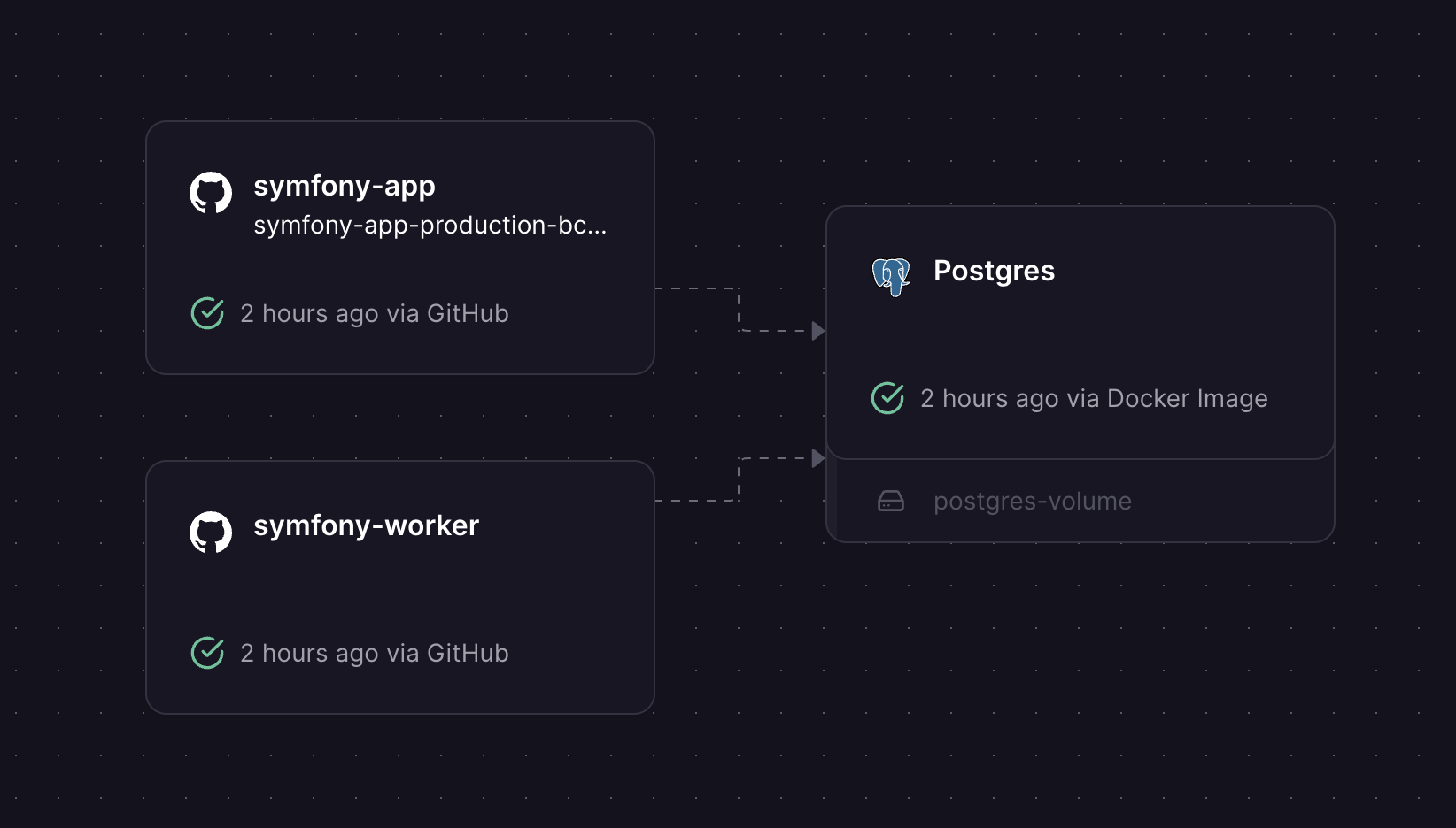 But back to the topic: recently I tried to deploy a Symfony application on Railway and realized that neither of the two existing deployment templates actually work. So I thought it can't be that hard and created a template myself. In fact, it was actually quite smooth and I managed to set everything up as a reusable template within two evenings. The deployment consists of an app service, a background worker service and a PostgreSQL database. Once you have a Railway account, you can deploy Symfony within a minute using one click.